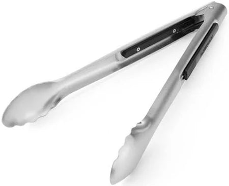 One-handed, soft-touch locking mechanism keeps tongs closed to take up less space in drawers