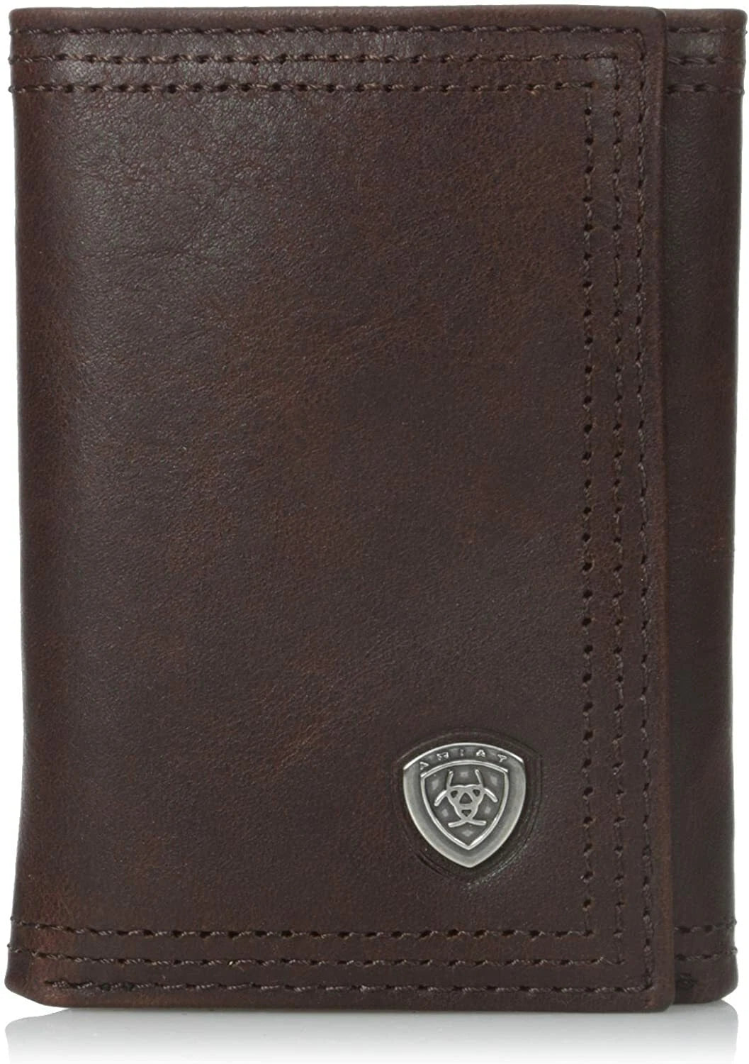 This Ariat Tri-fold Wallet features an oil tan dark copper leather and Ariat brand concho. Inside features a clear ID slot, credit card slots, removable photo slip, and money slots.