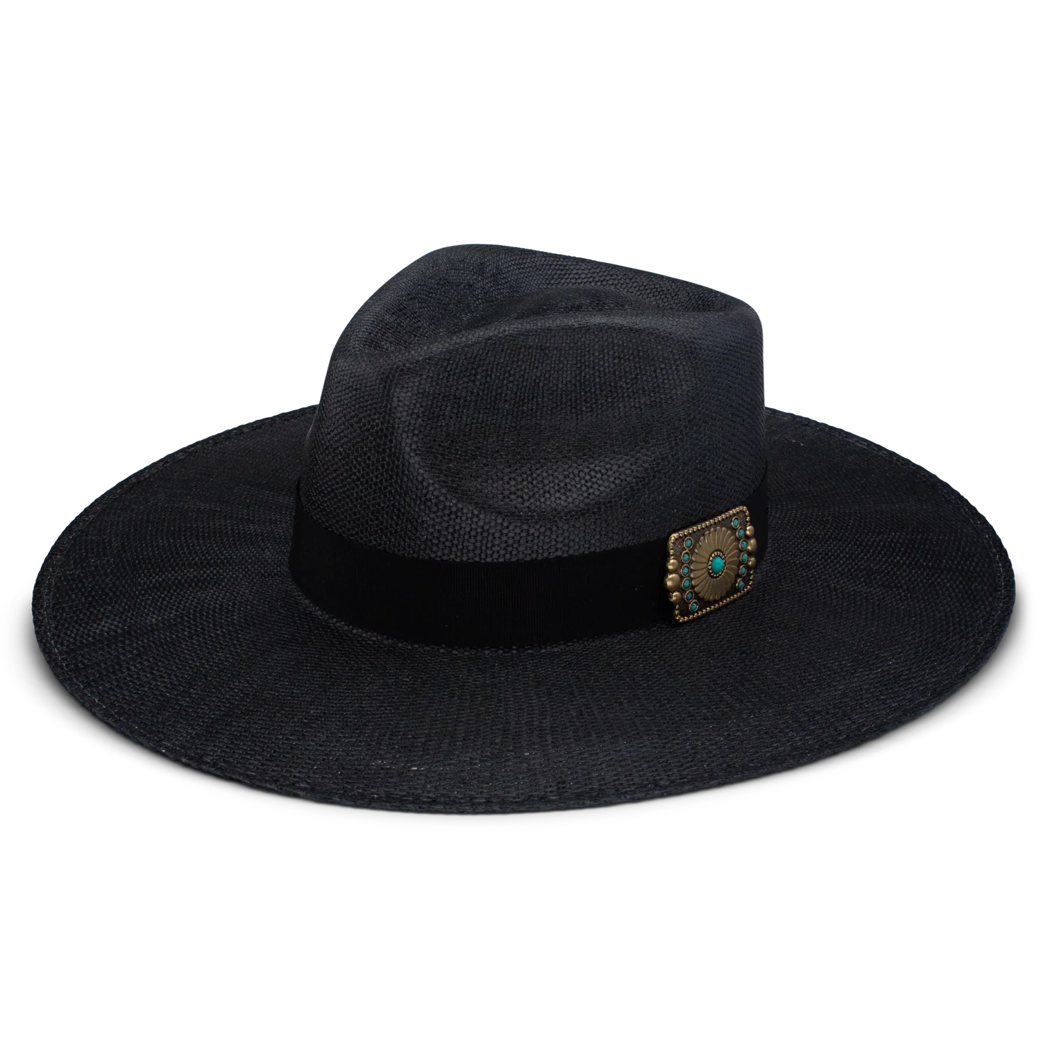 Make the Black Opal Hat your style signature for the spring and summer months. Part of the Charlie 1 Horse by Lainey Wilson Collection, this Bangora straw hat comes in a 4” brim with a 4 1/8” crown. The Black Opal has a fabric hatband and is accented with a rectangular concho featuring turquoise and metallic detailing. Perfect for everything from a wild night at the honky tonk to a lazy afternoon on the beach, the Black Opal Hat is a warm weather essential.