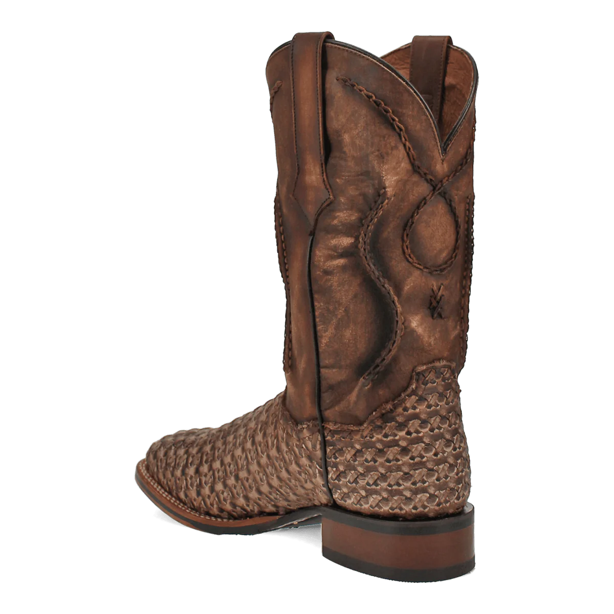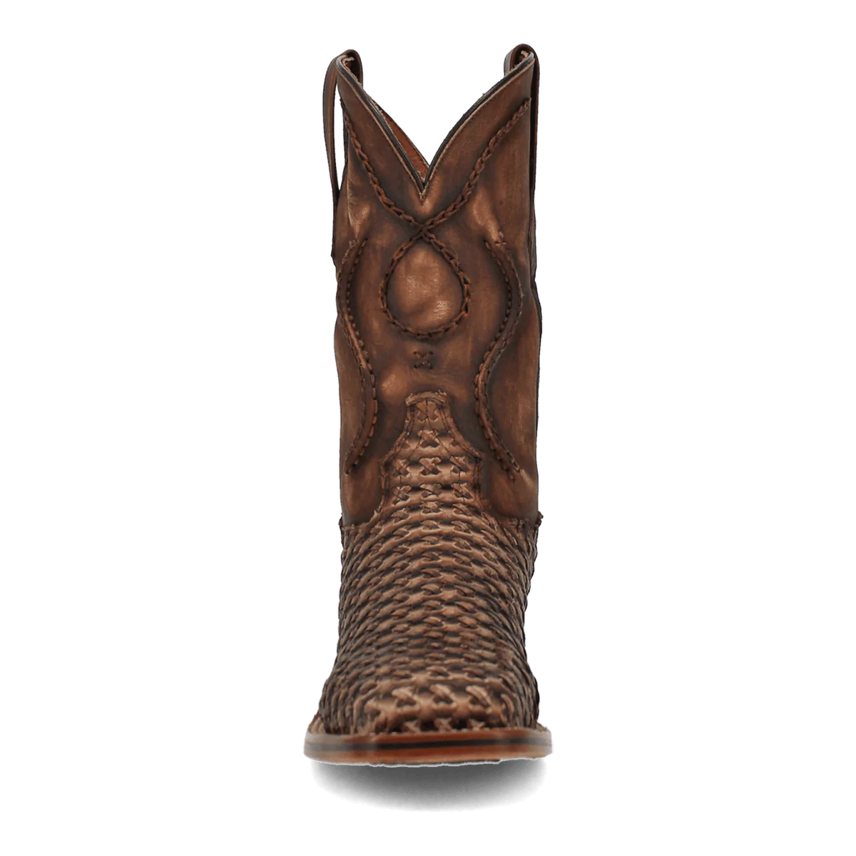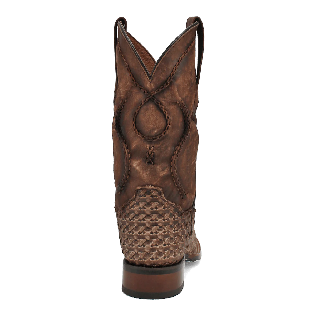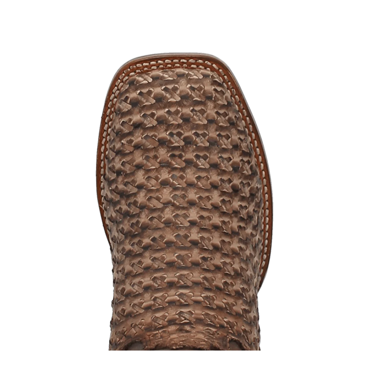 Craftmanship is front and center on the Cowboy Certified Stanley boot. The tan distressed upper has hand corded leather lacing. The foot is an intricate eye-catching woven leather design. The Soft Strike removable insert gives comfort from the first step. Featuring our popular broad square toe, stockman heel and long-wearing Cowboy Certified outsole. Innovative western design from top to toe.