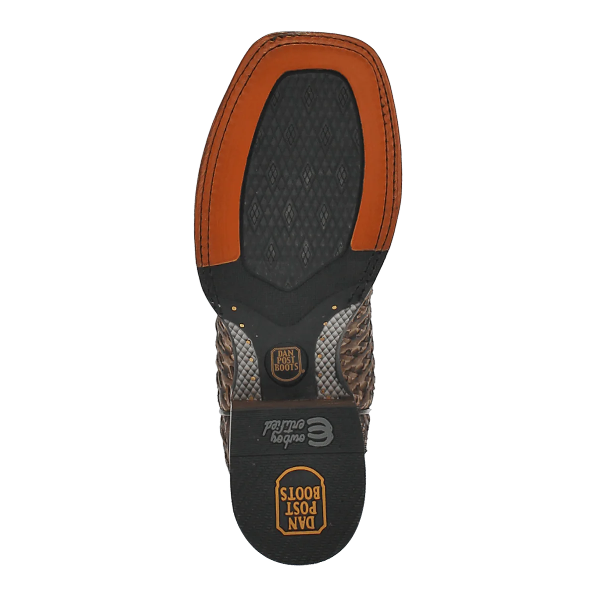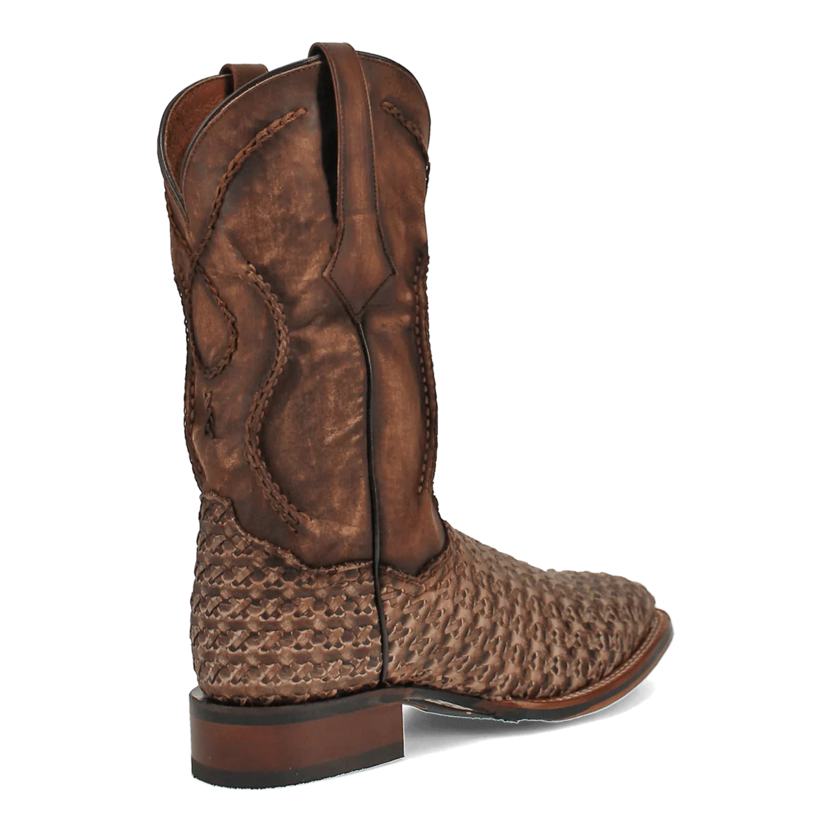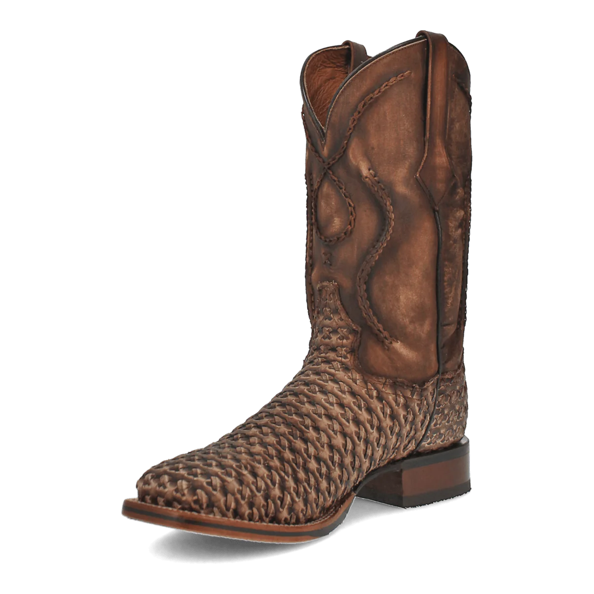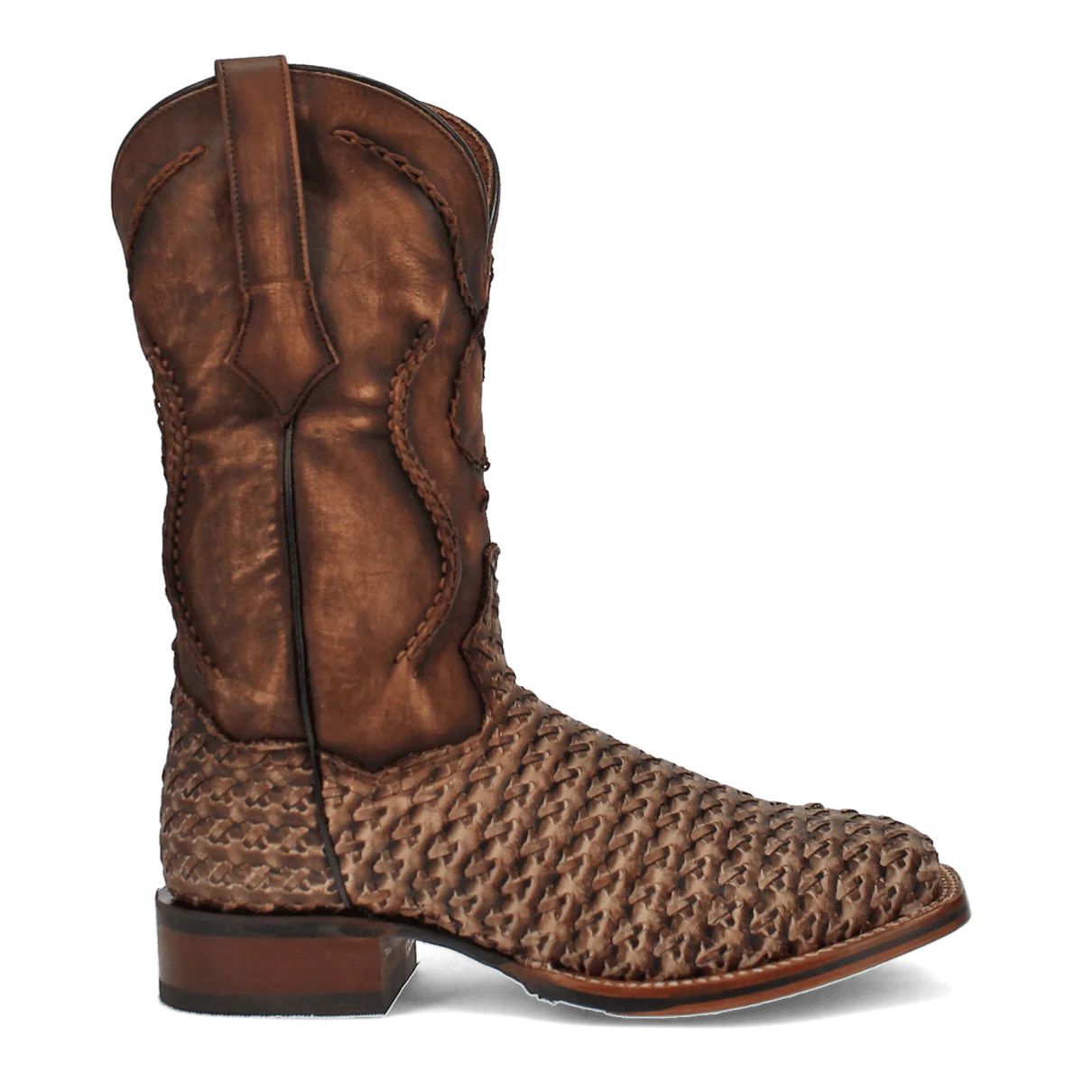 Craftmanship is front and center on the Cowboy Certified Stanley boot. The tan distressed upper has hand corded leather lacing. The foot is an intricate eye-catching woven leather design. The Soft Strike removable insert gives comfort from the first step. Featuring our popular broad square toe, stockman heel and long-wearing Cowboy Certified outsole. Innovative western design from top to toe.