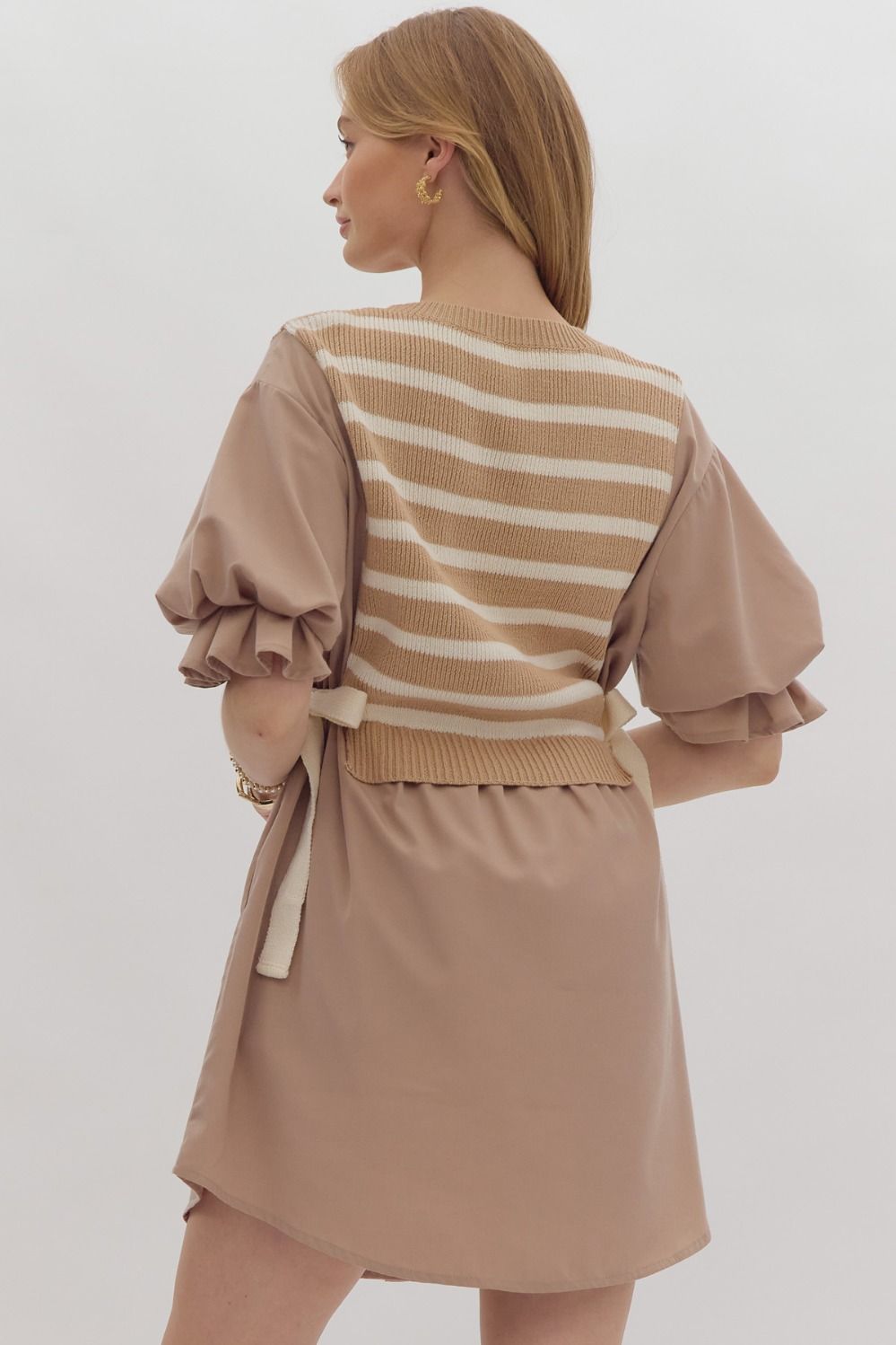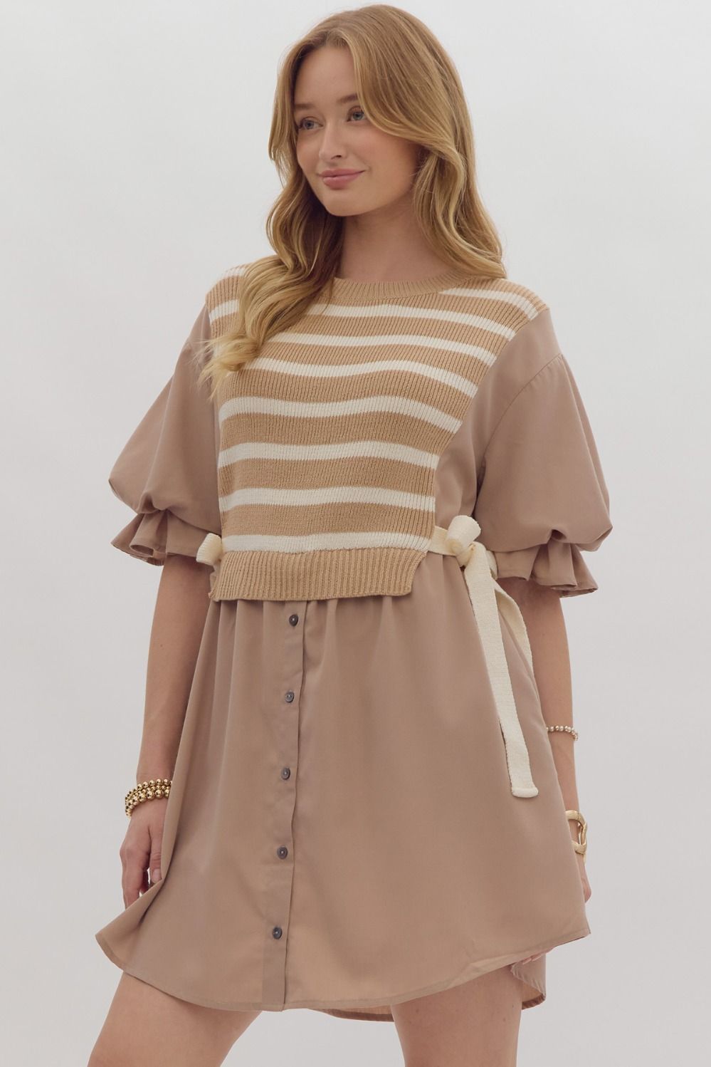 Stripe half sleeve twofer solid button down mini dress featuring pockets at side. Ruffled cuff. Self-tie detail at sides. Unlined. Woven. Non-sheer. Lightweight.