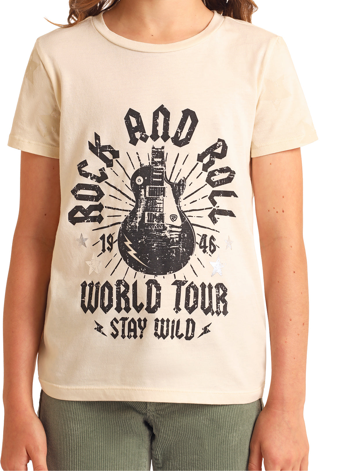 - Features a distressed black guitar print with bold "Rock and Roll" and "World Tour" text