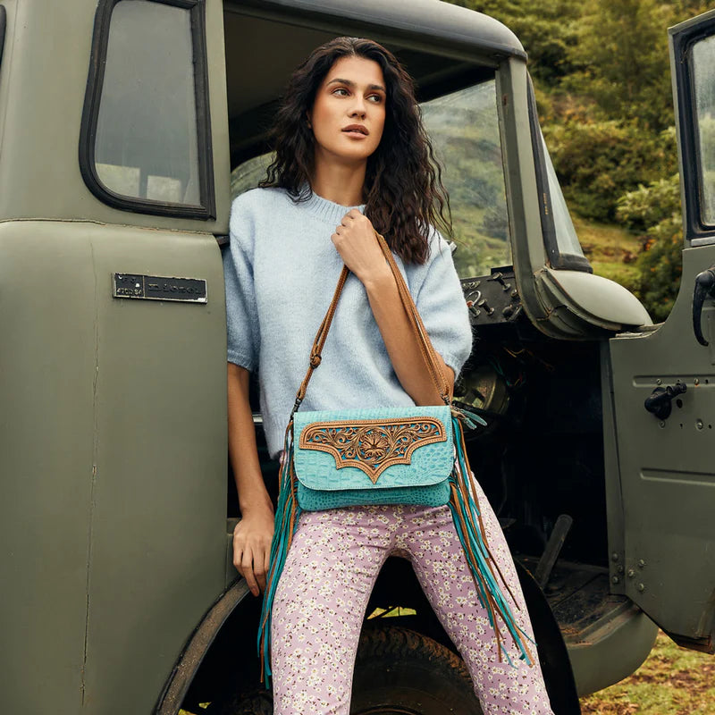 The Myra Heartsy Handtooled Bag is a heartfelt blend of charm and craftsmanship. Featuring premium hand-tooled and genuine leather, this western leather purse captures a nostalgic essence with its intricate design and cozy appeal. Striking dual-tone fringe accents bring a playful touch, while the spacious interior with an inside zipper pocket ensures functionality. This western tooled leather purse is perfect for those who love carrying a piece of art wherever they go, be it carnivals or sudden fun outings.