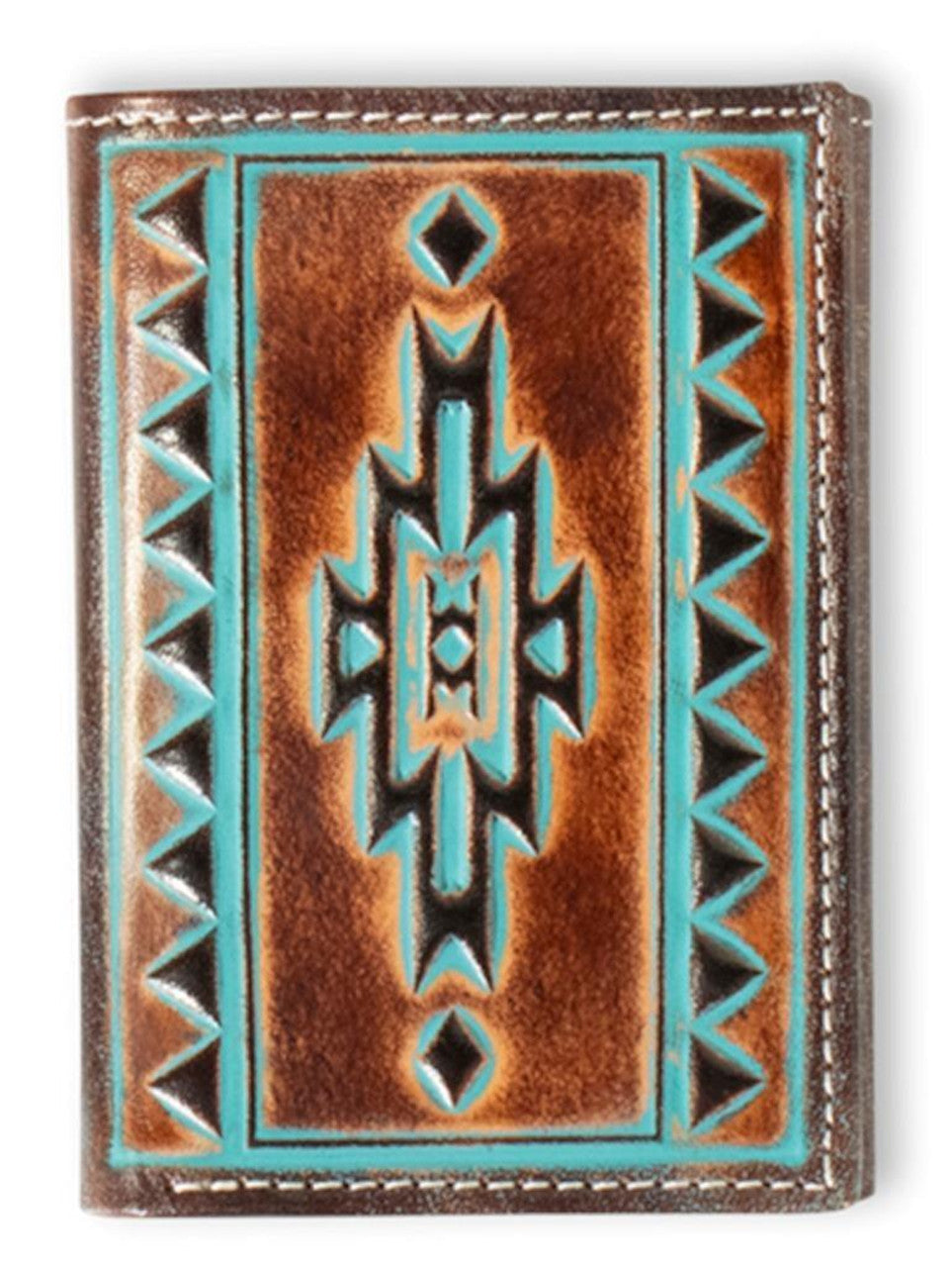 Ariat trifold wallet by M&F Western Products. This great wallet has a southwest embossed pattern that is trimmed in turquoise. Multiple card slots as well as a cash slot and ID window.