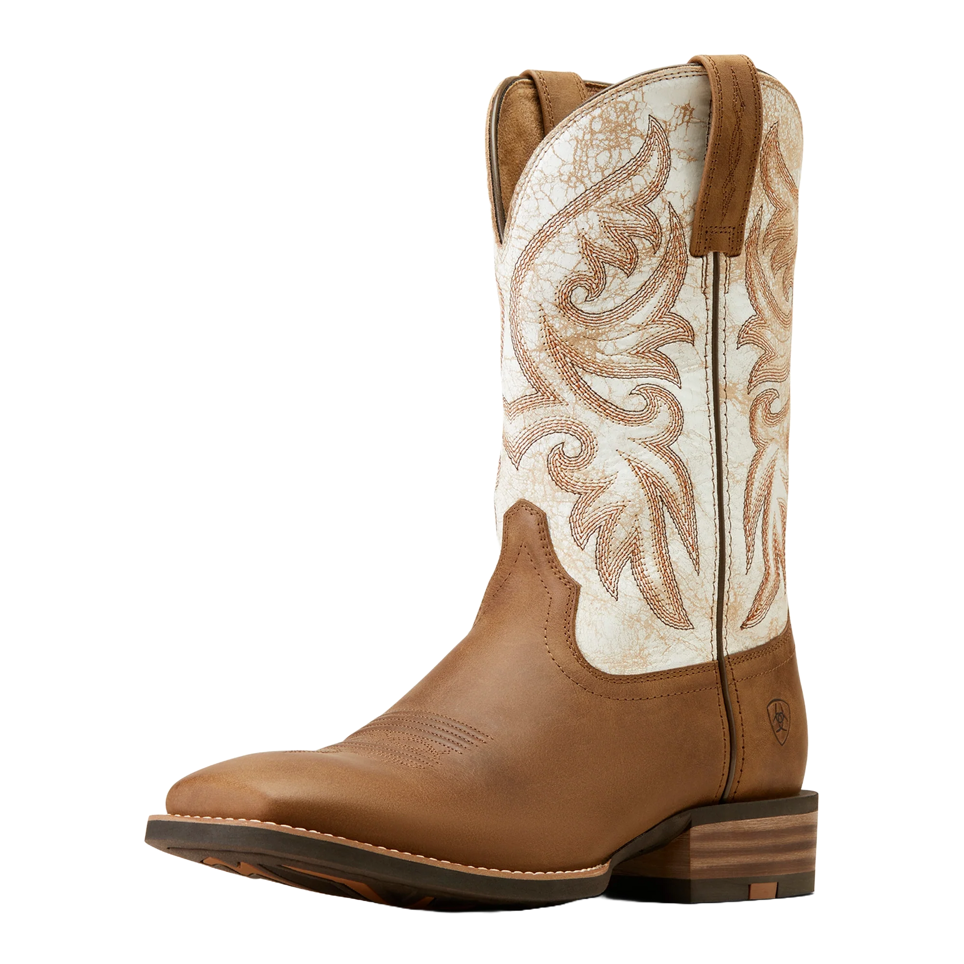 - Brown vamp and white shaft with western stitching