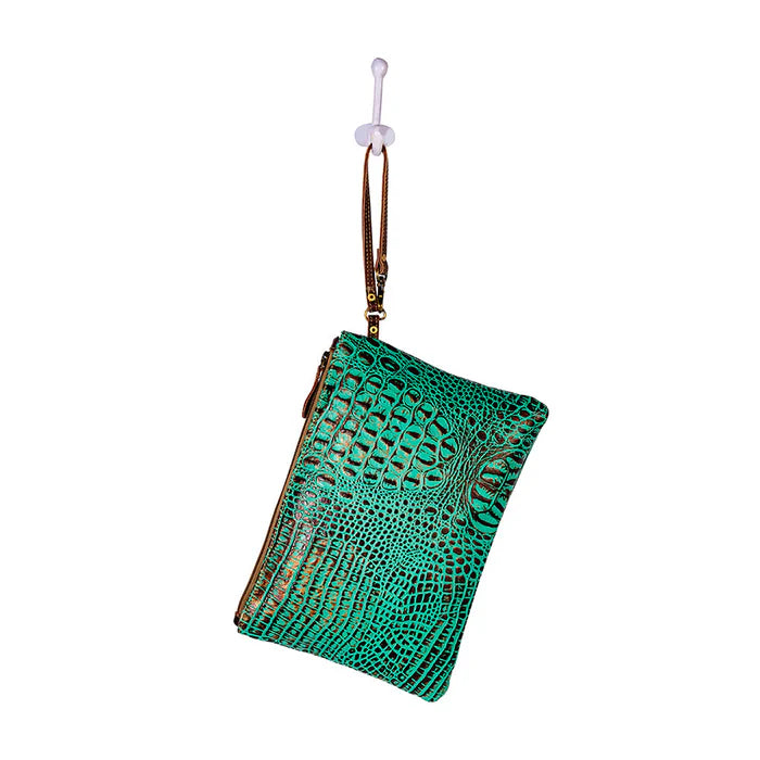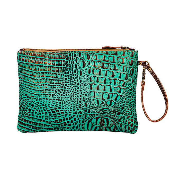 You’ll delight in this lovely bag! The croc patterned leather features a wonderful teal tone, embraced by a top panel of hand-tooled leather. Its timeless pattern is lovingly scrolled in tones of honey and dark chocolate brown. The back continues the croc patterned leather, and the zipper-close top keeps everything secure. Matching wristlet carrying strap in matching stitched leather completes the look.