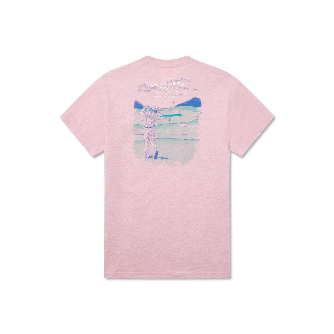 Inspired by rolling hills and challenging greens, our Pin High short sleeve cotton tee features a golfer swinging for his first Spring shot, capturing the spirit of the game. Designed with comfort in mind, this tee combines style and passion for golf, making it a perfect choice for enthusiasts.