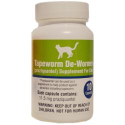 Tapeworm Dewormer Supplement for Cats easy to use capsules. Can be used as a supplement to help protect against parasites including tapeworm. Each capsule contains 11.5 mg praziquantel. Highly effective and safely removes tapeworm.
