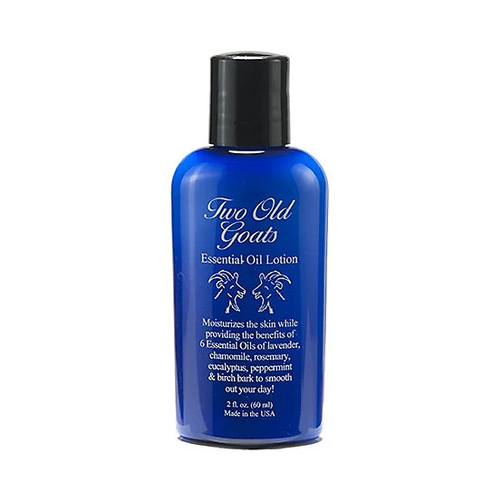 The Two Old Goats Goat Milk and Essential Oil Lotion has all the good things you have come to expect from lavender, chamomile, eucalyptus, rosemary, peppermint and birch bark. This highly effective lotion soothes tired, sore muscles with the power of goat's milk and therapeutic-grade essential oils. The lotion comes in a 2 oz. bottle.